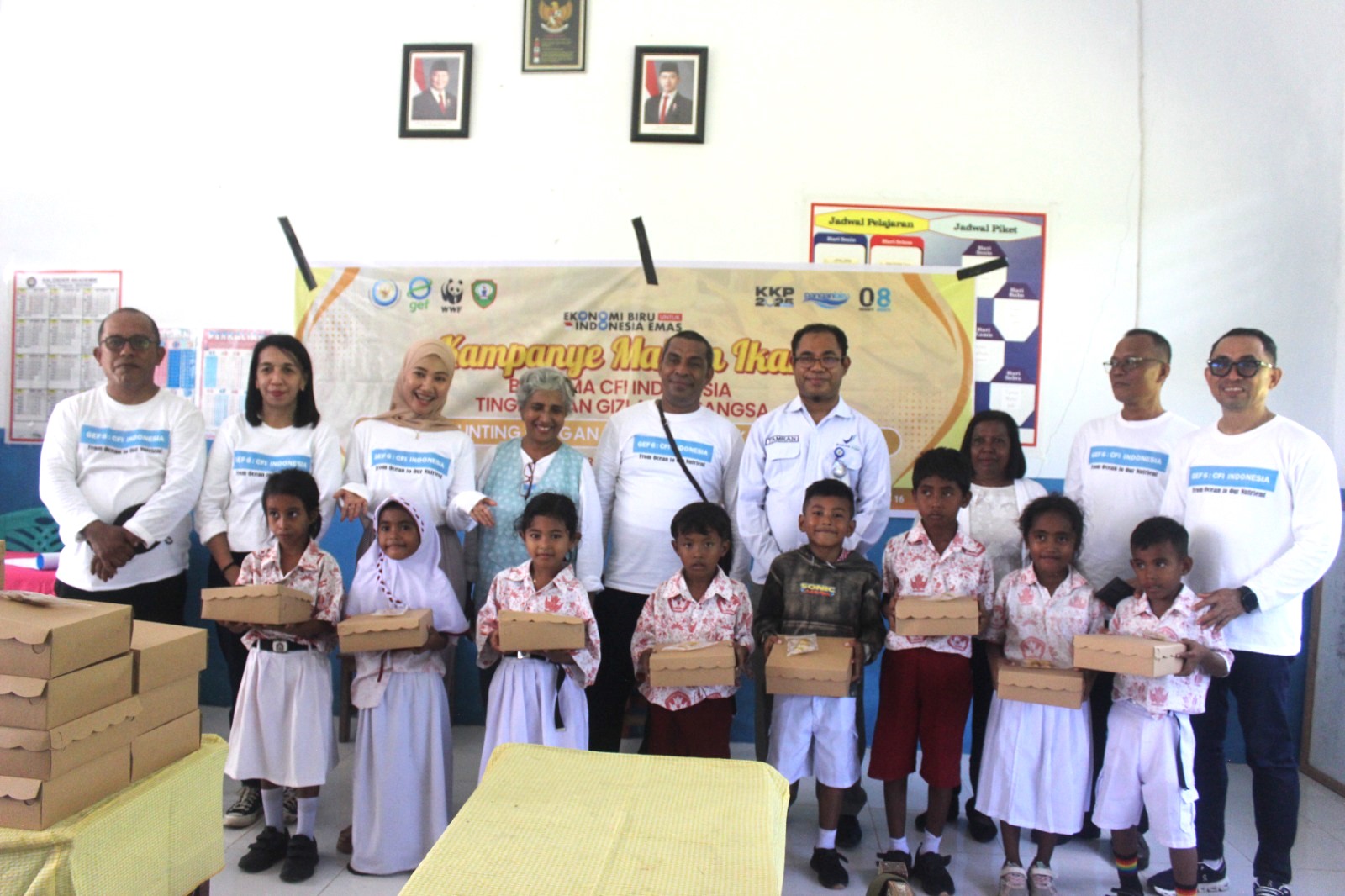 Rangkaian kegiatan Bimtek Kesiapan Kelompok Perempuan Pengolah Produk Olahan Perikanan Menuju Standar Program Makan Bergizi Gratis (MBG) Maluku Tenggara ditutup dengan pembagian makanan hasil olahan kepada 50 siswa SD Ohoidertaun, sekaligus launching produk MBG lokal berbasis ikan.