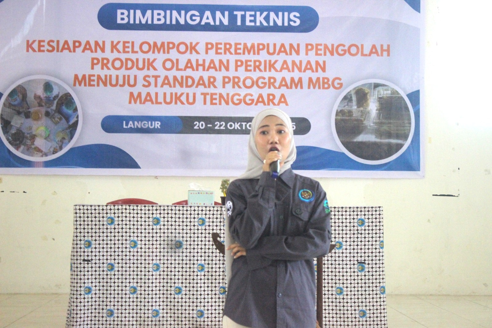 Safeguard and Gender Specialist PMU GEF 6 CFI Indonesia Fardiatum Amalia menyampaikan materi profik dan progress CFI Indonesia pada kegiatan Bimtek Kesiapan Kelompok Perempuan Pengolah Produk Olahan Perikanan Menuju Standar Program Makan Bergizi Gratis (MBG) Maluku Tenggara, Langgur (20/10/2025)